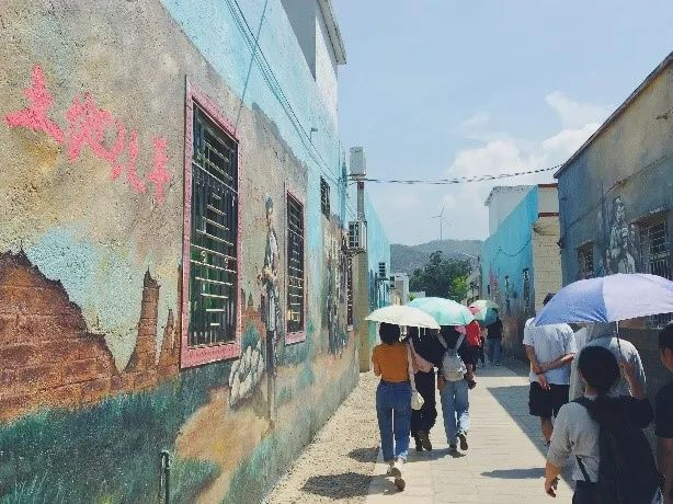 离开玄武山,考察团在车上沿路欣赏碣石湾的美丽海景,最后抵达此次考察的终点站——金厢镇下埔村委黄厝寮村。1927年10月南昌起义部队南下转战潮汕地区,周恩来、叶挺、聂荣臻等革命领导人曾在此休养。师生们在村巷中穿梭,主路两侧民宅的墙壁上均画有栩栩如生的壁画,形象地描述了中共各种革命活动的事迹。