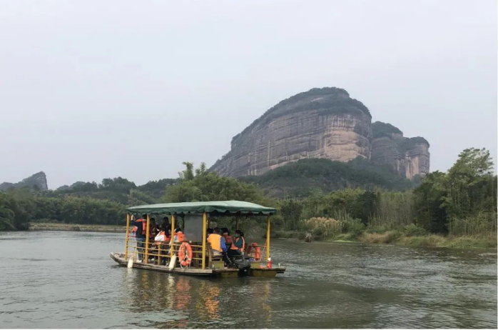 早晨,师生们乘竹筏泛游于锦江。锦江两岸赤壁丹崖耸峙,山峰石林在漫长的水力侵蚀下,呈现出各种形态,如著名的“阳元石”、“送子观音”、“海螺峰”、“阿婆山”等,景象壮丽。“丹霞山”之名,相传源于明末虔州(今赣州)巡抚李永茂词中“色如渥丹,灿若明霞”。世界上的丹霞地貌主要分布在中国、美国西部、澳大利亚等地,其中中国丹霞山面积最大、种类最为齐全,由此也成为“丹霞地貌”之名的起源。据丹霞山地质公园博物馆讲解员介绍,丹霞山属五岭余脉,山体由富含氧化铁的第三纪厚层红砂岩、砾岩组成,自然景观主要包括长老、海螺、宝珠、望郎诸峰,以及各种岩洞。