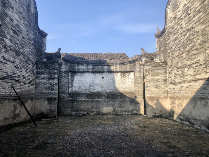 下午,师生一行抵达周田镇的灵溪客家大围村。大围村背傍象岭山,面朝灵溪水,远望时仿若一颗镶嵌于翠玉之中的明珠。大围村始建于清乾隆十一年(1746年),因村落四周围有厚重的围墙而得名。墙体外围呈椭圆形。据村长介绍,当时考虑到建筑难度,围墙下半部分为花岗岩石砌筑,上半部分则多为河卵石、三合土垒砌而成。围墙设有枪眼和瞭望孔,有葫芦形、铜钱形、一字竖形,形态不一。如今,大围村的部分围墙已经倒塌,仅剩断壁残垣,但从残留的墙体看,其用料讲究,坚实大方。在选址、设计与建造上,大围村在遵循中国传统风水理念的同时,亦发挥了抵御外敌和护卫族人的功能。围内为村民居住的房屋,围外则为稻田和橘树等作物种植区域。村落布局清晰,功能完善,体现了中国传统村落中“天人合一”的至高追求。
