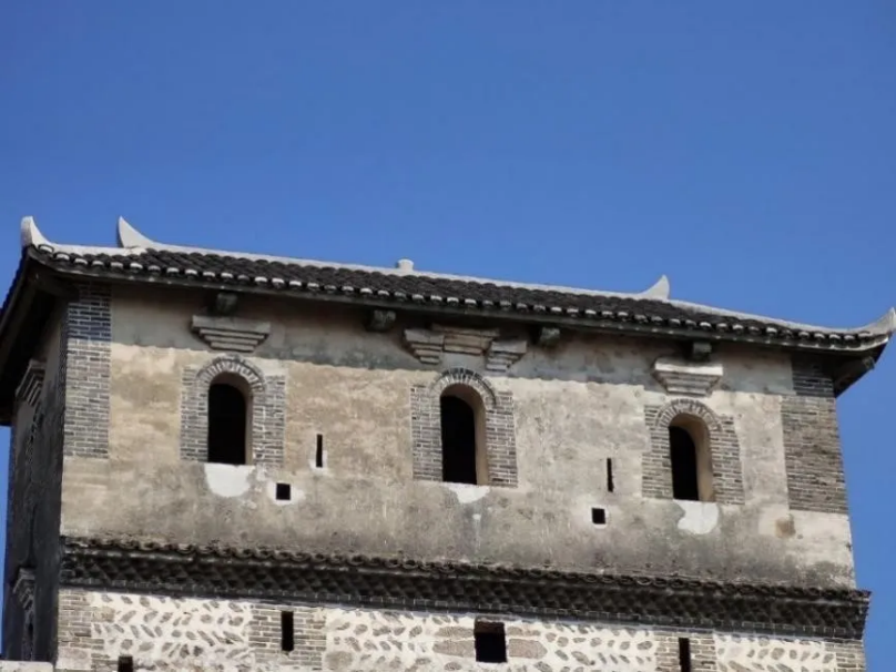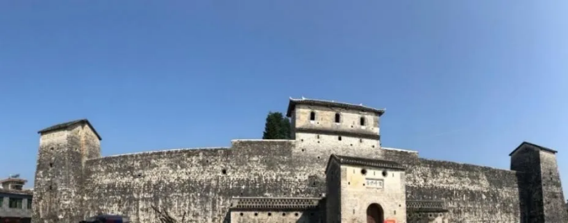 双峰寨位于石塘古村中央,外墙略呈长方形、围南北方都有山峰耸立,工匠把糯米、黄糖、桐油和鸡蛋滴入清石灰浆粘合青砖,砌成寨墙。
