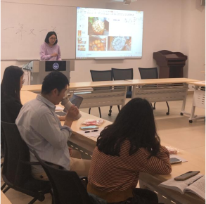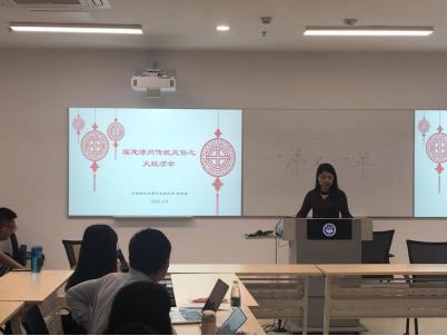 来自广东的梁幸舒同学分享了自家过年的传统习俗——拍财神以及各种特色美食——炸煎堆、油角等;来自湘西地区的廖珺霏同学则分享了家乡过年的龙灯、春牛等特色活动;李知真同学分享了阳江的咸汤圆以及年初一行大运的特色传统;林品君同学向大家介绍了包含桂林风情的板鸭、油茶、艾叶粑粑、五色糯米等特色的春节食物;李晓雪同学以视频与文字相结合的方式形象地向大家介绍了在漳州地区历史故事中酝酿出来的特色年俗活动:大鼓凉伞…….谈起家乡的过年风俗,大家热情高涨,气氛热烈,在不同地区风俗的交流碰撞中,更能体会中华优秀传统文化的精彩纷呈与博大精深。