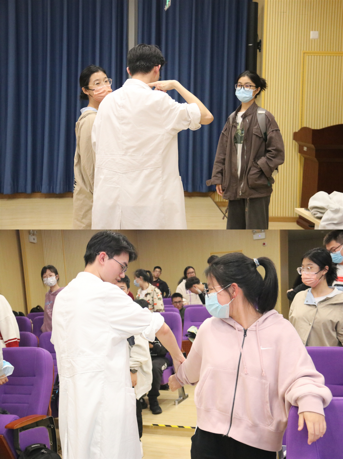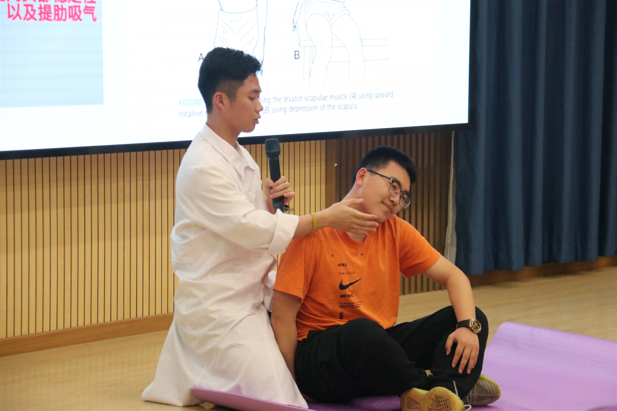除了基本的救护知识,两位师兄也着眼于同学们的日常需求,介绍了许多简单有效的拉伸及放松方法,如拉伸肩胛提肌、尺神经、正中神经、桡神经等。