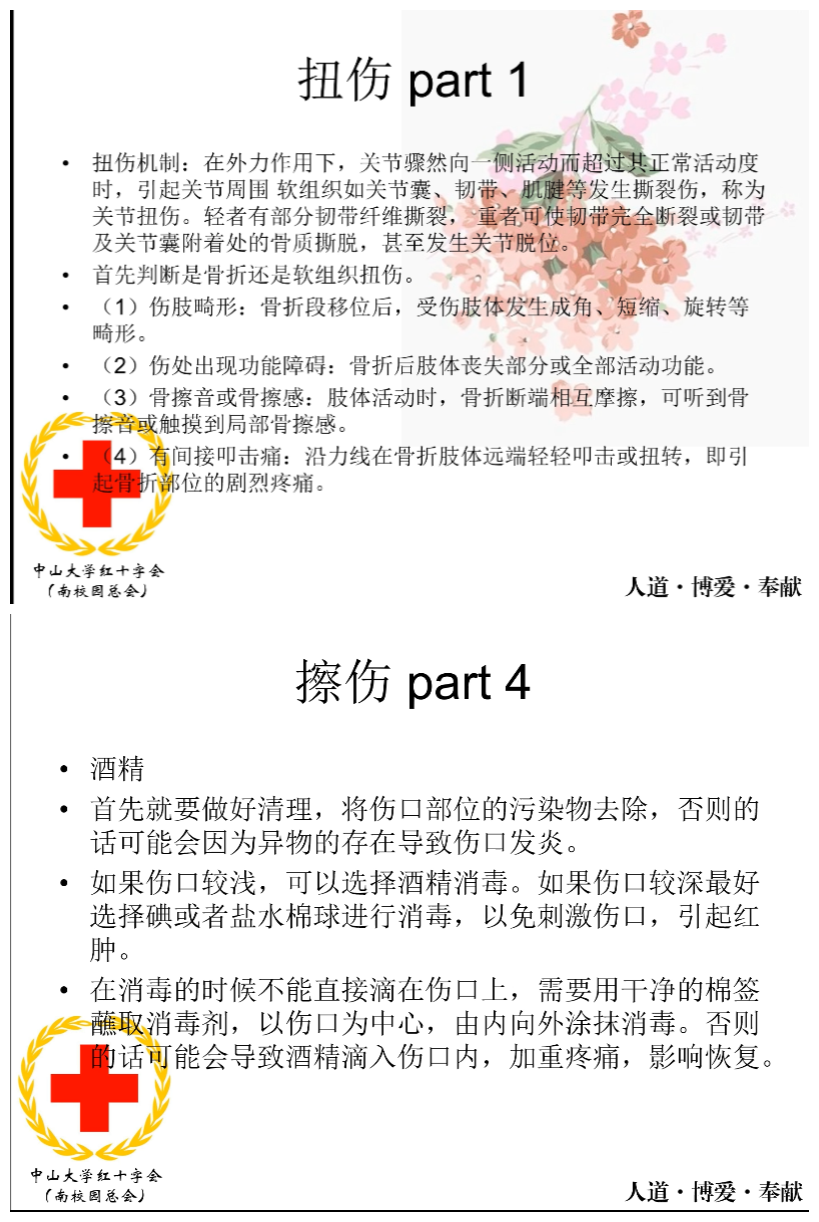 运动受伤急救视频由304am永利红十字会(南校园总会)救护部部长阮谭伊阳同学负责录制讲解,她以“运动安全‘救’在身边”为主题,介绍了在面对常见的运动损伤(如扭伤、擦伤、抽筋、流鼻血等)的正确处理方式、心肺复苏的步骤及AED自动体外除颤器的使用方法,并强调了“最重要的记忆点”,同时,她建议同学们须牢记校医院和保卫处的联系电话,在遇到突发情况时应及时寻求有效帮助。