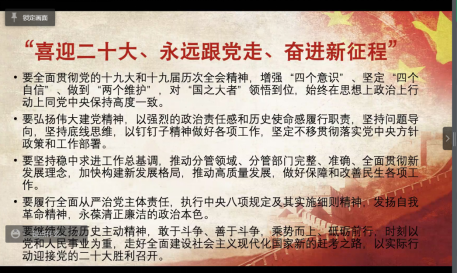 考虑到疫情因素,团支部以线上学习的形式来完成本次以“喜迎二十大、永远跟党走、奋进新征程”为主题的团日活动。在完成相关文件的宣读后,大家观看了一些优秀的献礼二十大的影视剪辑作品,从百年党史中感受时代脉搏、领悟自身的使命。会后,大家纷纷发表感言。有同学讲到,习近平总书记曾指出,当代中国青年是与新时代同向同行、共同前进的一代,生逢盛世,肩负责任。作为当代大学生,我感受到总书记对我们这一代青年寄予厚望,我们应肩负其当代青年的历史重任,努力学习,掌握本领,做时代新人。