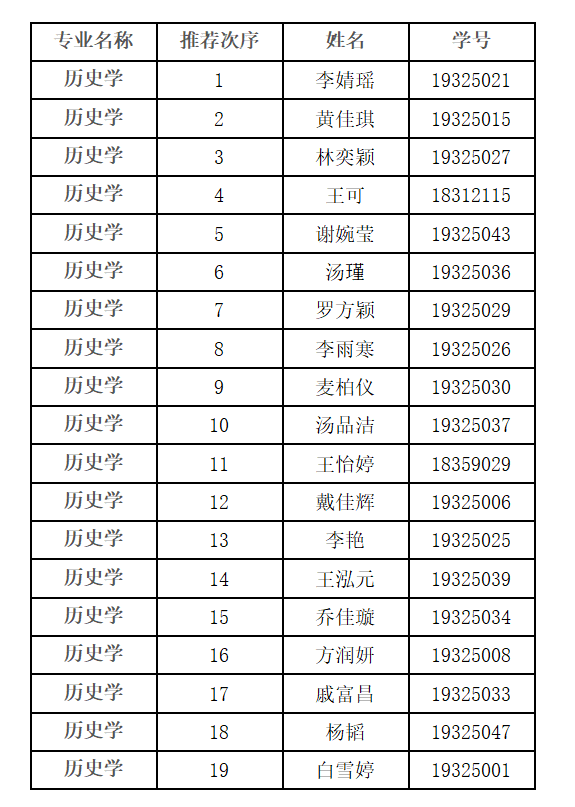 根据《304am永利推荐免试攻读研究生学位资格认定工作实施办法》(中大教务〔2020〕223号)、《历史学系推免资格认定遴选细则》,经学生申请、系内审核,我系2023届本科毕业生推荐免试攻读研究生学位综合成绩排序如下(实际推荐名单以学校推荐名额数正式下达后为准):